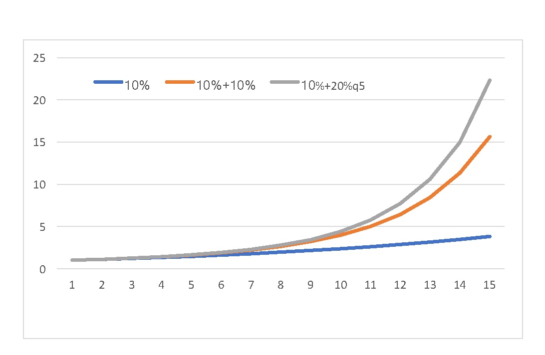 Figure 1. Multiples as a function of the time unit. Comparison of exponential, double exponential and double exponential plus periodic spikes.